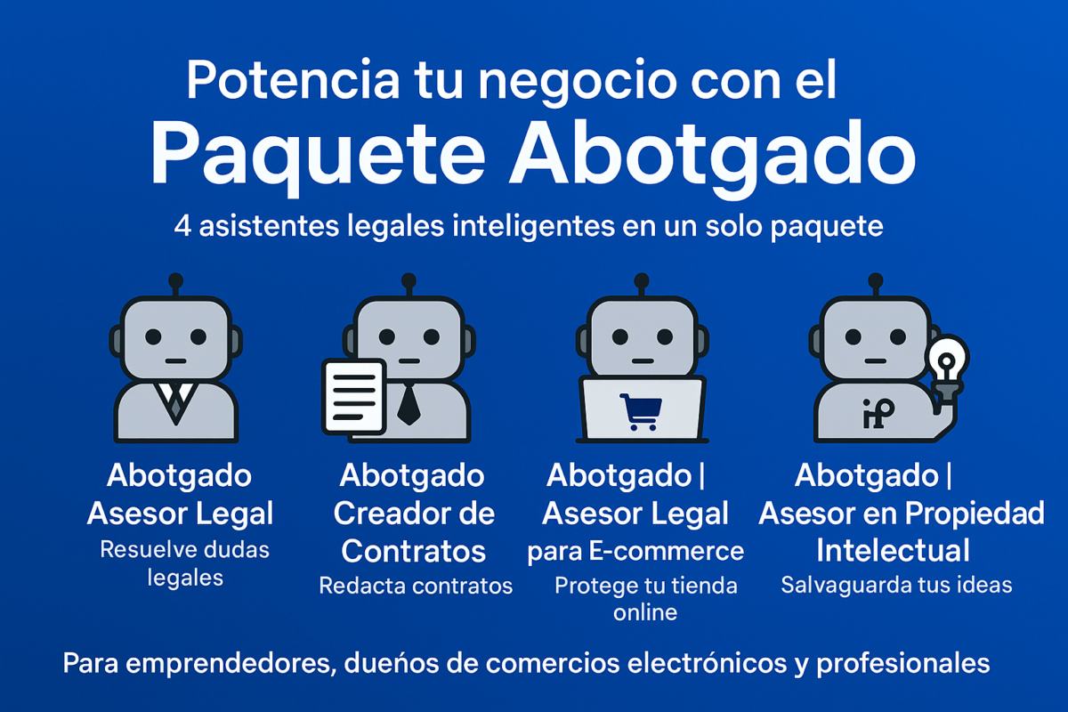 Presentamos el Paquete Abotgado, un conjunto de 4 asistentes legales inteligentes, diseñados para cubrir todas las áreas jurídicas que necesita tu empresa, tienda online o emprendimiento digital.